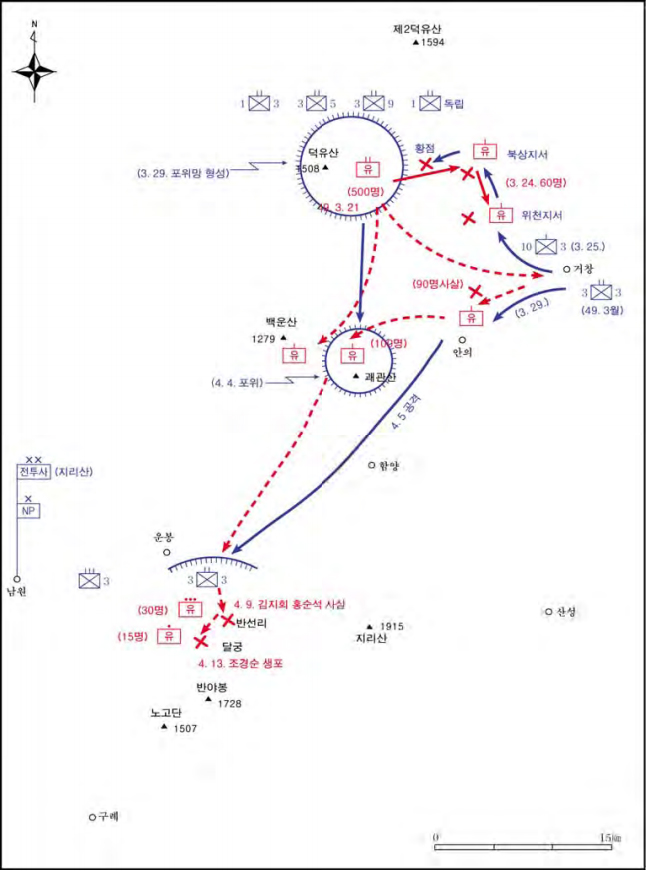 지리산지구전투사령부는 즉시 예하 전 병력과 경찰력을 동원하여 군․경 합동으로 덕유산을 포위할 작전계획을 수립하였다. 이 포위작전에는 제3연대 제1대대, 제3대대, 제5연대 제3대대, 제9연대 제3대대, 그리고 독립제1대대(일명 서울유격대) 등 5개 대대와 경찰부대가 참가하였다. 3월 28일 밤 분산되어 있던 각대대와 경찰부대는 함양에 집결하여 다음날 밤 덕유산에 대한 포위망을 형성하였다. 30일 정일권 전투사령관은 작전부대를 진두지휘하여 포위망을 압축하기 시작하였다. 이러한 상황에서 반란군들은 토벌작전이 시작된 후 2차에 걸쳐 거창을 습격하기도 했다. 전투사령부에서는 반란군의 거창 습격이 토벌부대의 관심을 딴 데로 돌리려는 양동이며, 이들은 반드시 괘관산에서 잠시 휴식한 후 지리산으로 이동할 것이라고 판단하였다.