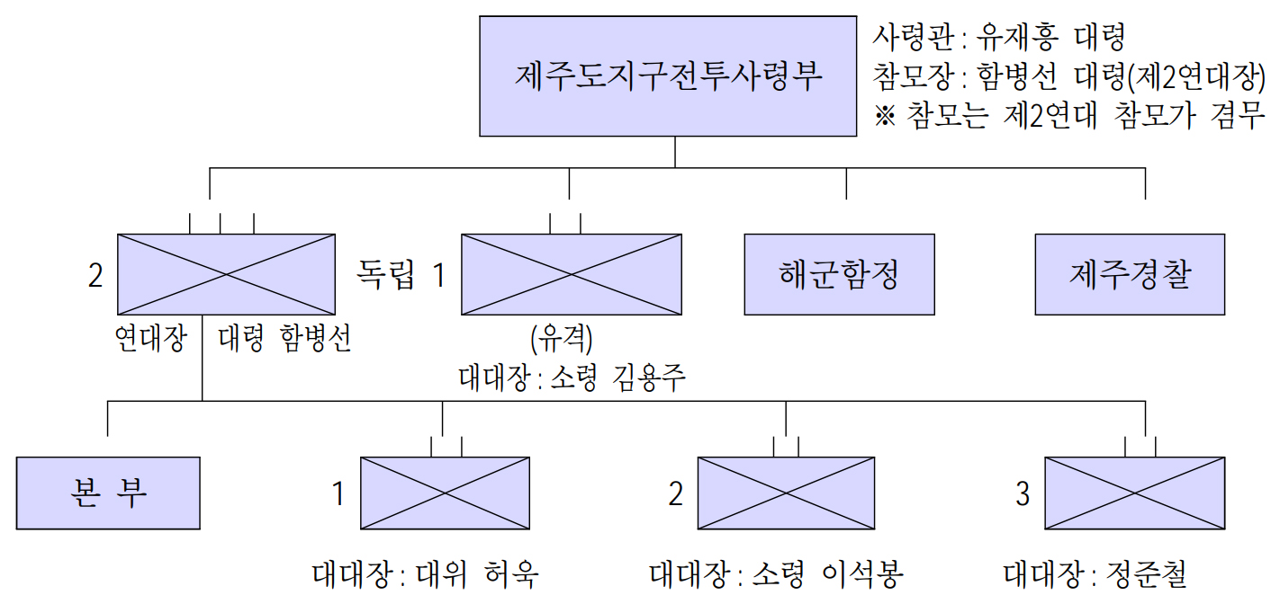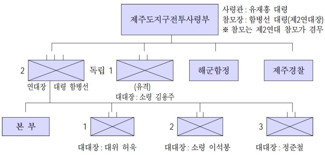 1949년 3월에 창설된 제주도지구전투사령부는 본격적인 토벌작전 개시 후 약 2월 반만에 전투사령부를 해체해도 될 만큼 큰 전과를 올렸다. 이 무렵 제주도의 무장대 조직은 거의 와해되어 제기불능상태에 이르렀다. 이에 따라 1949년 5월 18일부로 제주도지구전투사령부가 해체되고 제2연대는 8월 13일 제주도경비임무를 독립제1대대(대대장 소령 김용주)에 인계한 후 인천으로 이동하였다. 제주도전투사령부의 해체는 사실상 제주4․3사건의 종결을 의미하는 것이었다. 비록 이후에도 독립제1대대(1949. 8. 13~12. 28)와 해병대사령부(1949. 12. 28~1950. 6. 25)의 소탕작전이 있었지만, 작전의 성격은 인민유격대의 소탕보다는 민심을 수습하여 도민들의 재기를 돕는 대민활동에 맞추어졌다. 이러한 작전은 1950년 6월 25일 북한군의 전면남침이 있기 전까지 지속되었다.